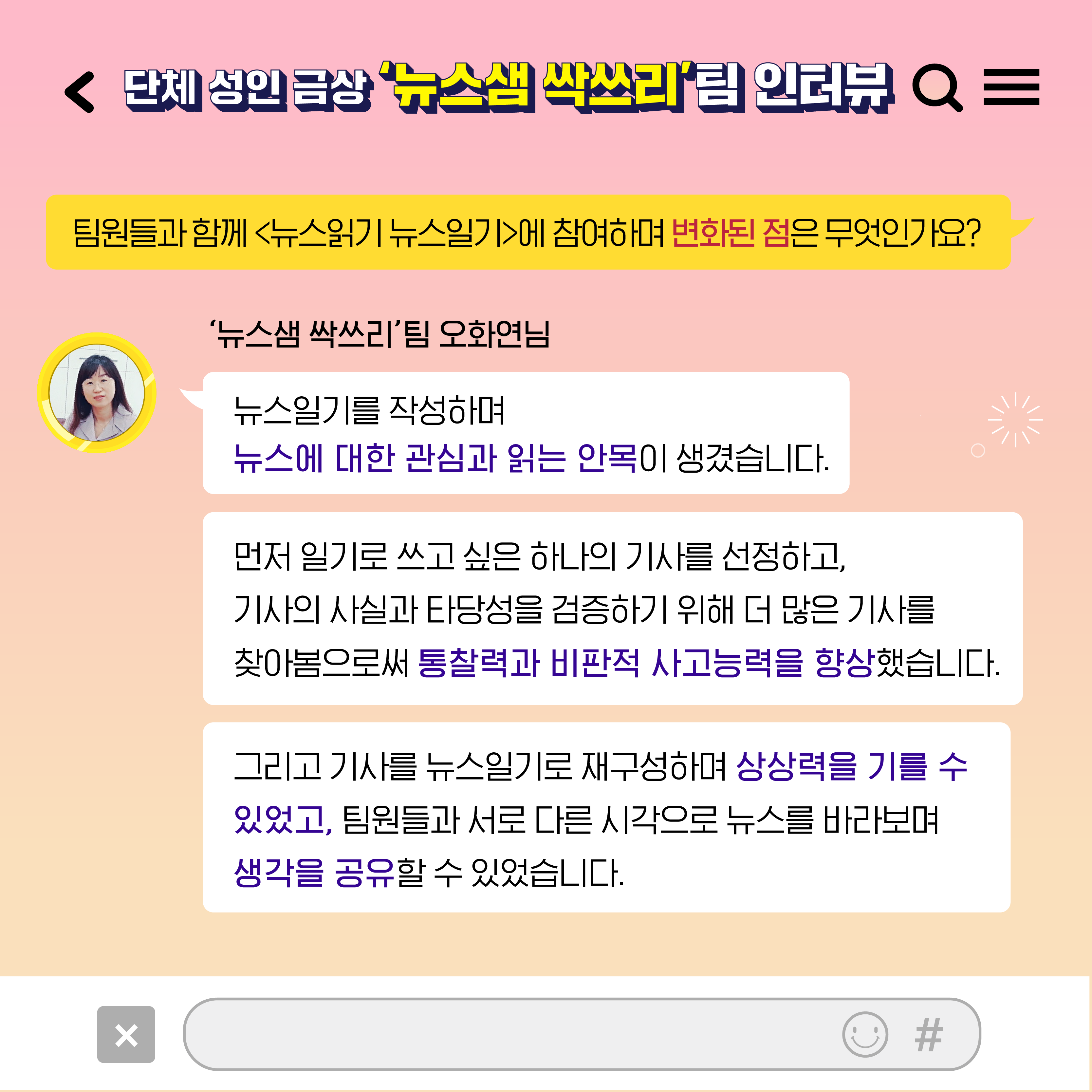 제2회 공모전 단체 성인 금상 ‘뉴스샘 싹쓰리’ 팀의 인터뷰 만나보아요~