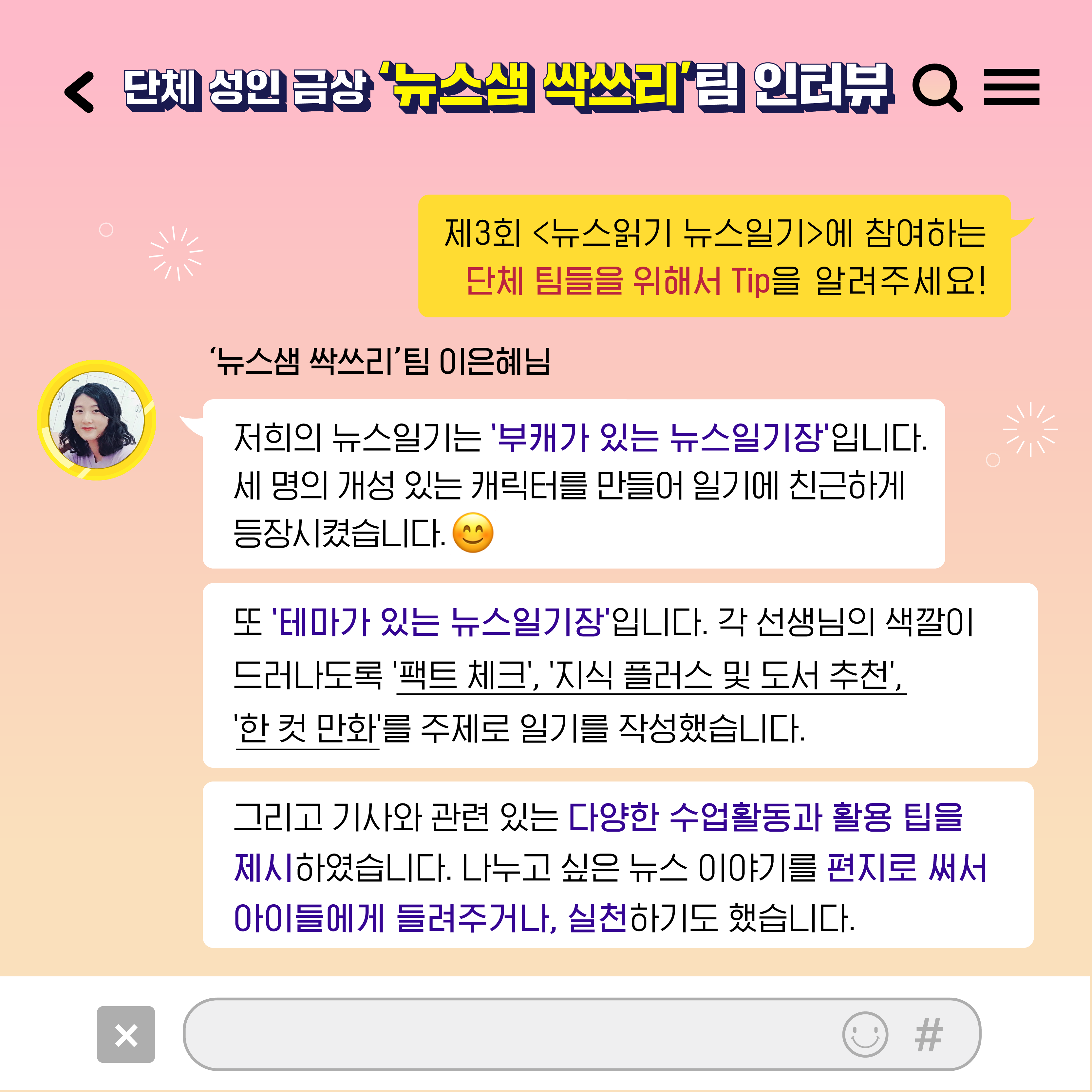 단체 팀에게 줄 수 있는 ‘뉴스샘 싹쓰리’ 팀만의 뉴스일기 작성 Tip은?