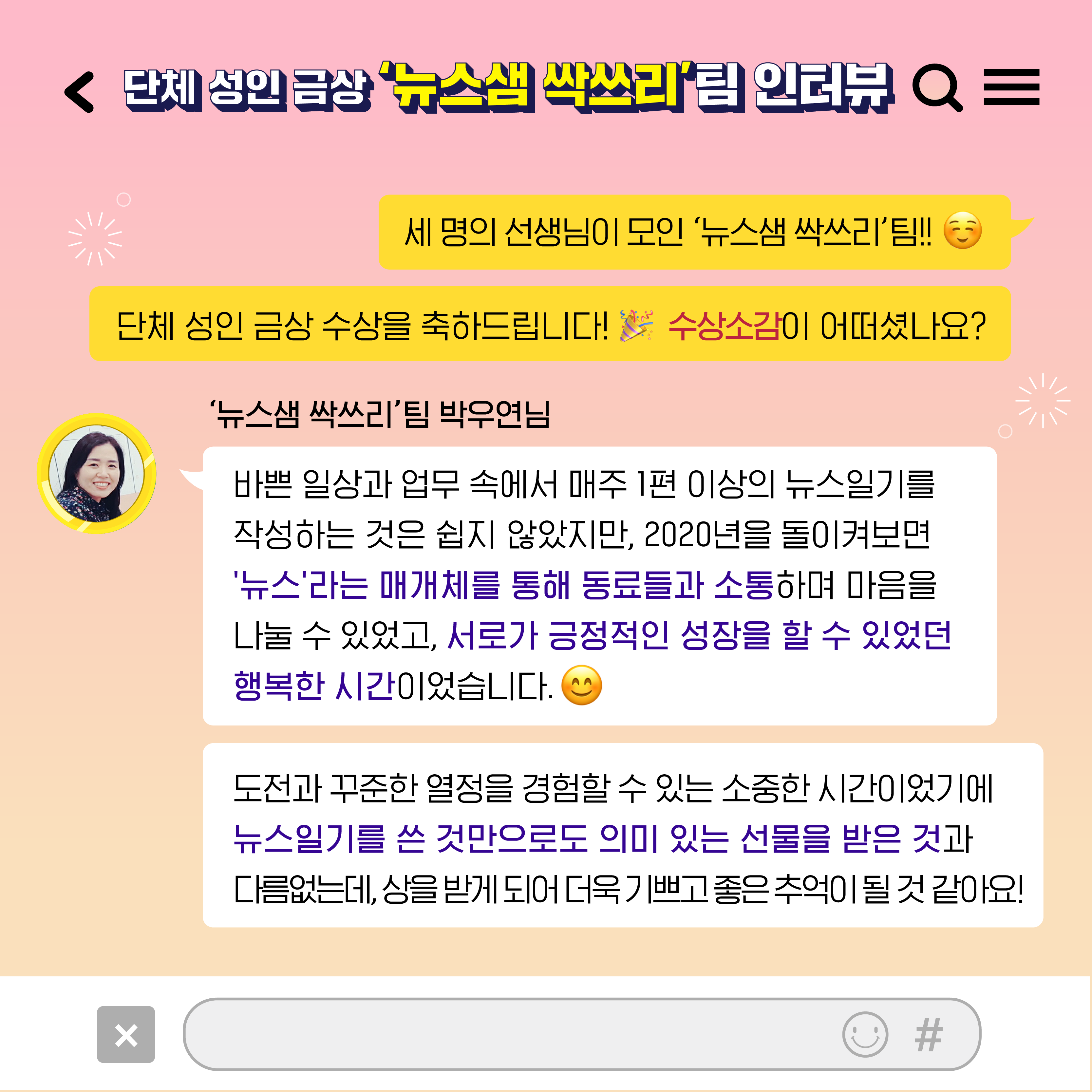 제2회 공모전 단체 성인 금상 ‘뉴스샘 싹쓰리’ 팀의 인터뷰 만나보아요~