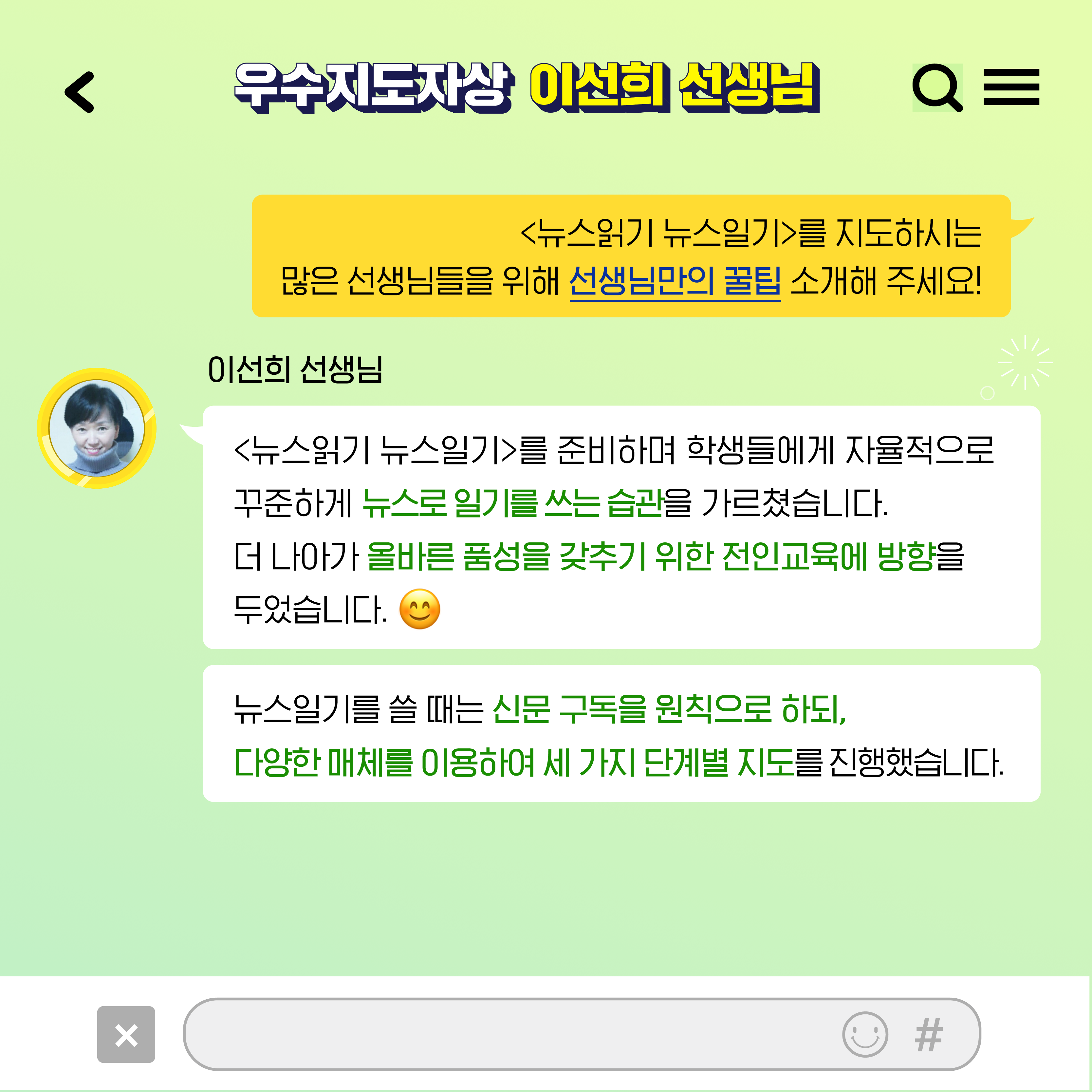 학교, 학원, 동아리, 가정 내의 뉴스일기 지도자분들인데요!