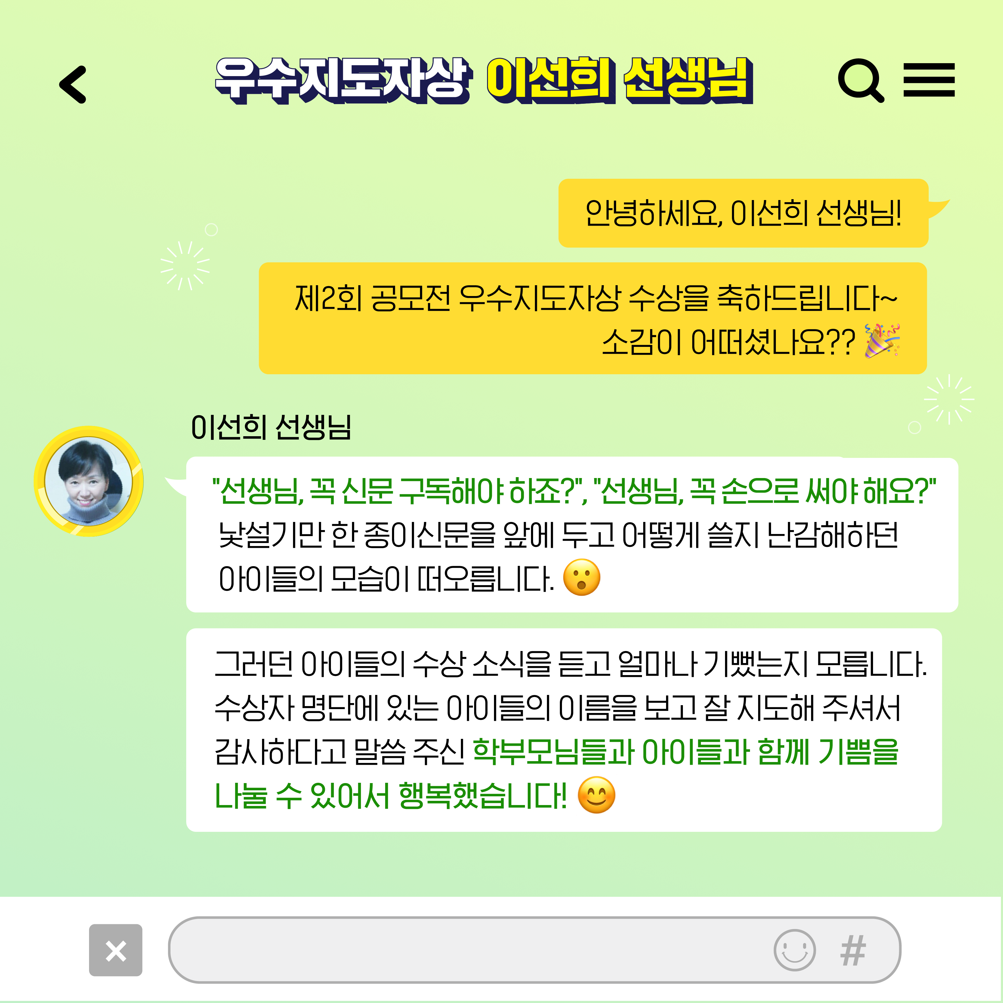 우수지도자상 이선희 선생님의 인터뷰를 들어볼까요?