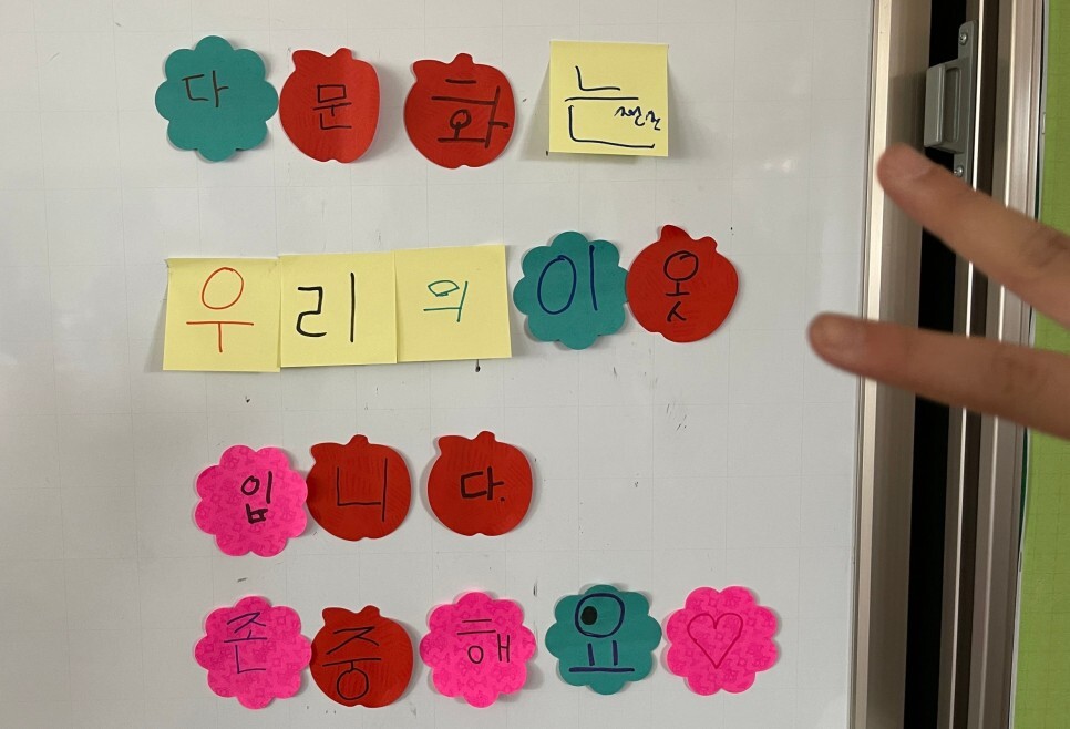 준비된 모든 수업을 마치며 아이들은 수업 중간중간 함께 외쳤던 슬로건을 포스트잇에 다 같이 한 글자씩 적었다. “다문화는 우리의 이옷입니다. 존중해요♡” 다문화 친구가 이웃의 ‘웃’ 자를 ‘옷’자로 잘못 쓴 글자마저 정답다.