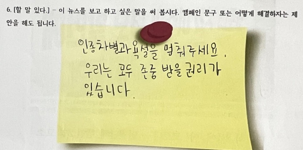 다문화 뉴스 읽기 첫 수업의 주제는 ‘혐오’였다. 우선 혐오를 다룬 뉴스 두 개를 준비했다. 우리나라 교민이 미국에서 혐오의 대상이 되어 테러를 당한 뉴스와, 우리나라에서 다문화 2세를 향해 코로나 관련 혐오 발언을 한 사람을 인권위가 고소했다는 뉴스였다.