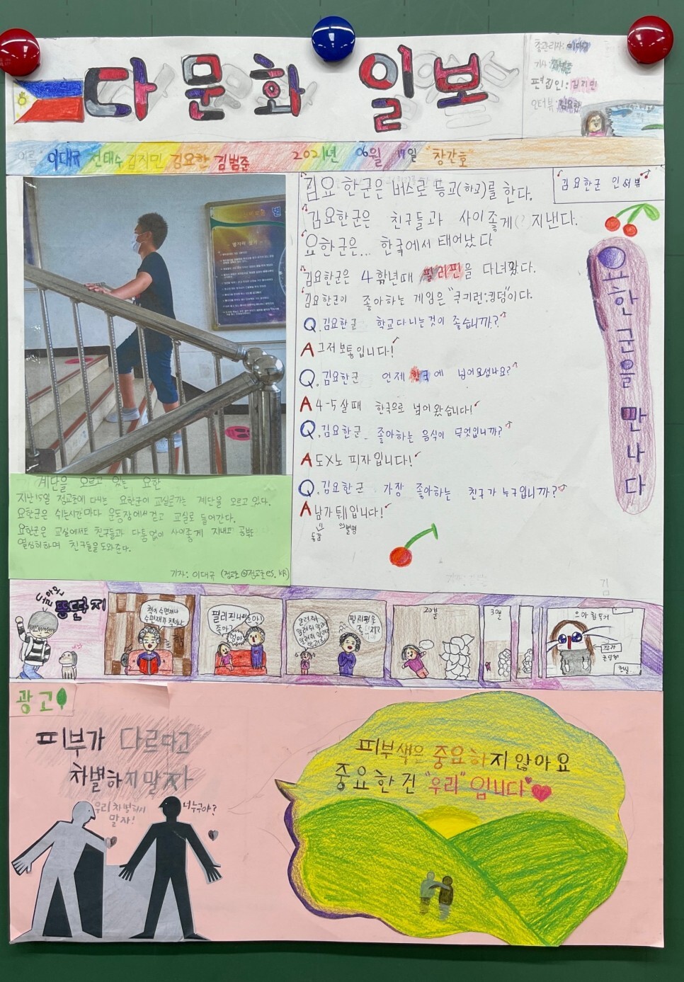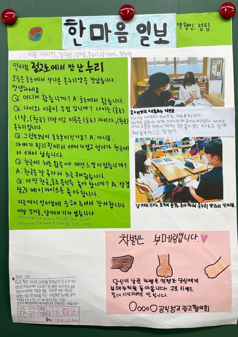 인터뷰 사진이 완성됐다. 다문화 가정 친구들은 자신의 이야기보따리를 서슴없이 풀면서 그 어느 때보다도 진지한 모습이었다. 또 자신의 역할이 신문 제작에 중요하다는 사실을 알았는지 무척 적극적이었다. 열심히 친구들을 인터뷰하고 그 내용으로 끙끙대며 기사를 쓰는 아이들의 모습이 정겨웠다. 언제 저 아이들이 다문화 가정 친구에게 이토록 관심을 가져 봤겠는가. 아이들은 다문화 가정 친구가 한국에 언제 왔는지, 어디서 살고 있는지 이제야 알게 됐다. 서서히 지면이 채워지고 광고 제작도 마무리됐다. 인터넷을 뒤져 공익 광고를 찾아보고, 교실 안에 이리저리 뒹굴던 어린이신문을 자세하게 보면서 드디어 신문을 완성했다.