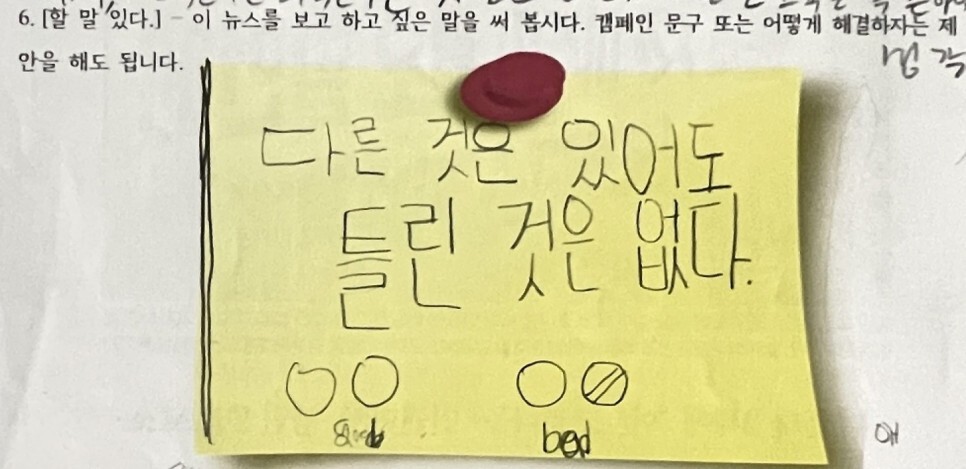 ‘혐오’를 주제로 진행한 다문화 뉴스 읽기 수업 시간에 학생들은 뉴스 기사를 비교하여 읽은 뒤 ‘혐오’에 대한 자신들의 생각을 적어보았다. <사진 출처: 필자>