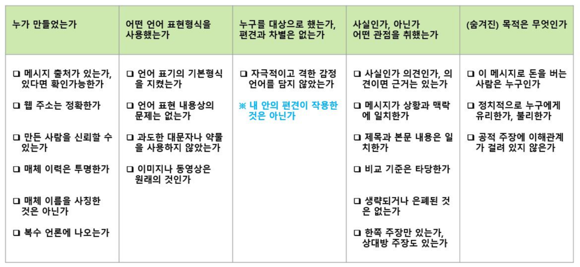 2차시에서 5차시까지는 미디어 리터러시의 본질이라 할 수 있는 비판적 사고의 원리와 방법을 질문 형태로 제시한 뒤 원리를 소개하면서, 소위 허위정보를 포함해 미디어 메시지의 진위 여부와 옳고 그름을 판별하는 방법을 다루었다. 본래 5개인 핵심 개념들을 다시 20개 질문으로 세분화하고 각각 질문별로 사례를 분석하면서 수업 참가자들이 쉽게 이해할 수 있도록 도왔다<표2 참조>. 이를 위해 일상에서 흔히 접할 수 있는 미디어 속 가짜뉴스와 오도된 주장, 고사성어와 속담, 역사적 사건, 그리고 교과서에 나오는 문학 작품 등 다양한 사례를 준비해 발표와 토론을 곁들여 진행했다.