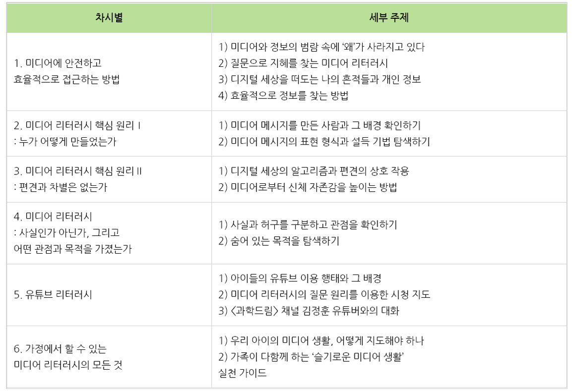 이런 배경에서 필자는 아이들의 미디어 생활과 관련된 학부모의 궁금증을 해소하고 나아가 학부모 미디어 리터러시의 방향을 제시해 본다는 차원에서 국립중앙도서관과 함께 ‘학부모를 위한 미디어 리터러시 아카데미’를 개설했다. 5월 7일부터 21일까지 6차시에 걸쳐 온·오프라인으로 진행된 강좌의 내용을 개략적으로 소개한다.