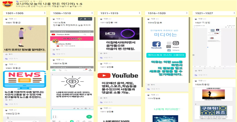 앞에 제시한 세 가지 주제로 이미지를 모두 편집한 뒤 완성 작품을 ‘패들렛’2)에 올려서 모두 함께 공유하고 서로 피드백을 주고받았다. 학급 전원의 작품이 모두 업로드된 ‘패들렛’ 화면을 교실 TV에 띄워 놓고 한 명씩 앞으로 나와서 친구들 앞에서 발표했다. 학생들은 친구의 발표를 들으며 궁금한 점이 있으면 자유롭게 질문하고, 발표자는 친구들의 질문에 대답하면서 ‘미디어’가 자신의 성장에 끼친 영향에 대해 성찰해 볼 수 있는 기회가 되도록 수업을 설계했다. 다음은 ‘오늘의 나를 만든 미디어’ 활동 시간에 학생들이 만든 작품이 전시돼 있는 패들렛 전체 화면의 모습이다.