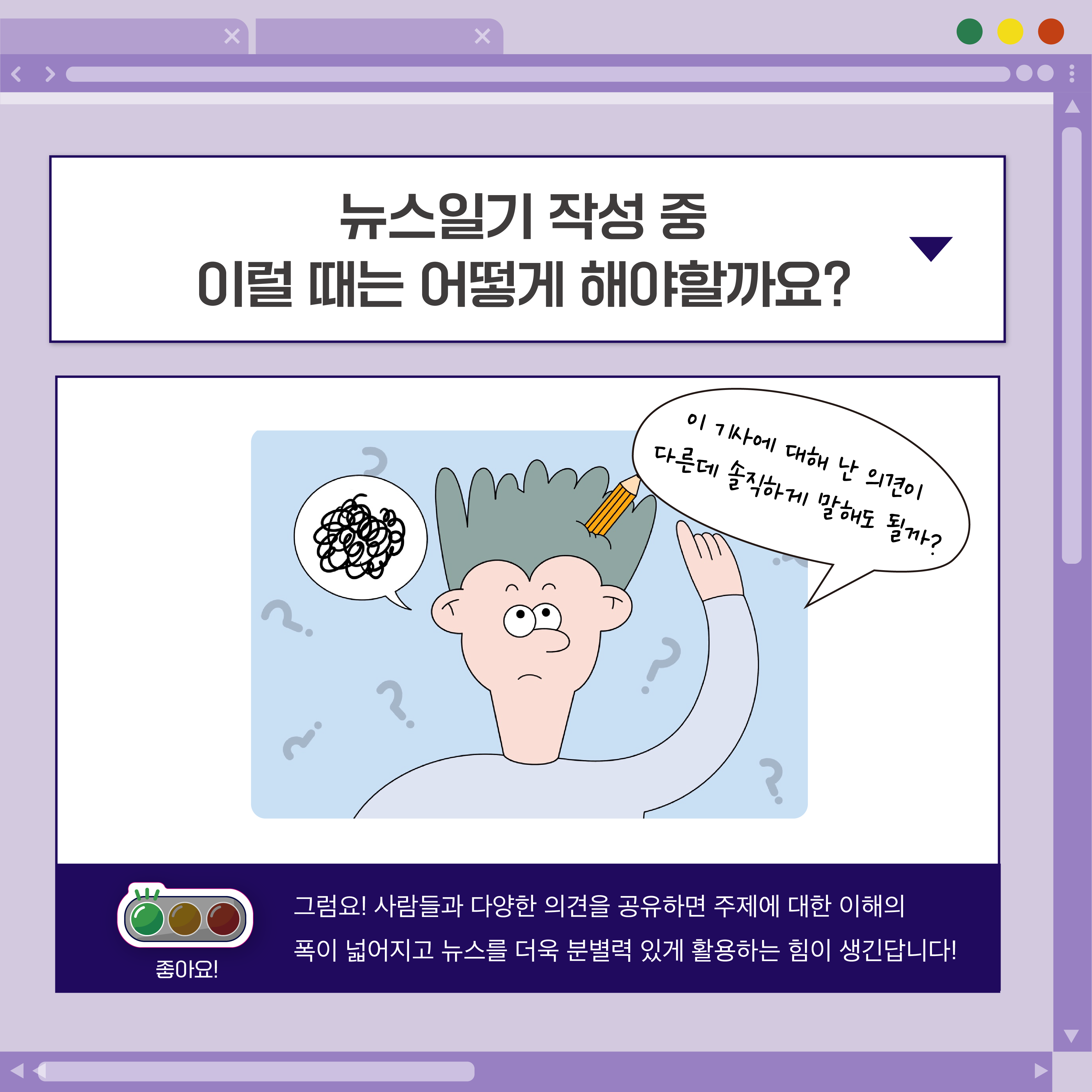 둘째, 뉴스 기사에 계속 질문을 던지며 비판적 사고를 기를 수 있어요!
