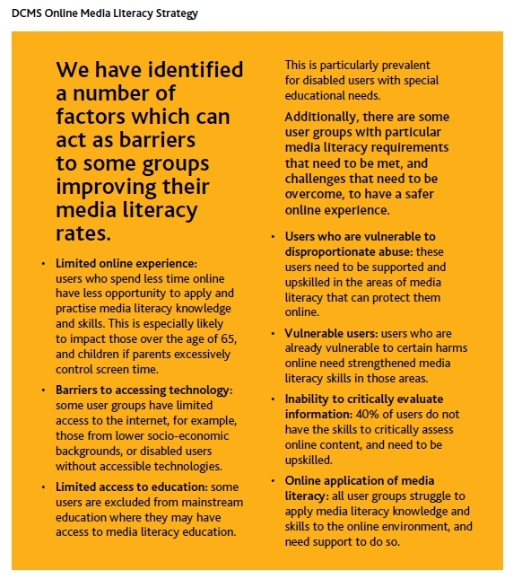 최근 영국 문화미디어부는 이용자의 미디어 활용 능력과 핵심 지식을 키우기 위해 ‘온라인 미디어 리터러시 전략(Online Media Literacy Strategy)’을 발표했다. 이 전략은 향후 3년간 영국에서 미디어 리터러시 활동을 수행하는 170여개 조직에 대한 지원 계획을 담고 있다. 영국 공영방송 <BBC> 또한 미디어 리터러시 교육을 ‘공적 책무(public purpose)’로 부여받은 주요 조직 가운데 하나다.