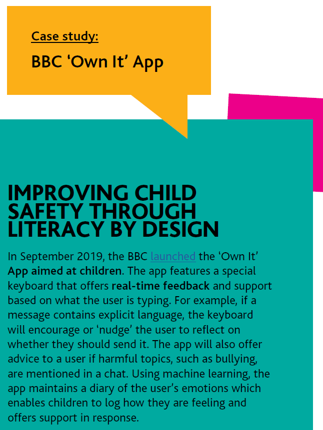 2019년 9월 출시된 ‘오운 잇’은 어린이가 인터넷을 안전하게 즐길 수 있도록 <BBC>가 지원하는 애플리케이션이다. 이 앱은 사용자가 입력하는 내용에 대해 실시간으로 피드백을 준다. 노골적인 언어가 포함된 메시지를 사용하면 한 번 더 생각하도록 권장하고, 채팅할 때 ‘왕따’ 같은 단어가 등장할 경우 주의를 환기시켜준다.