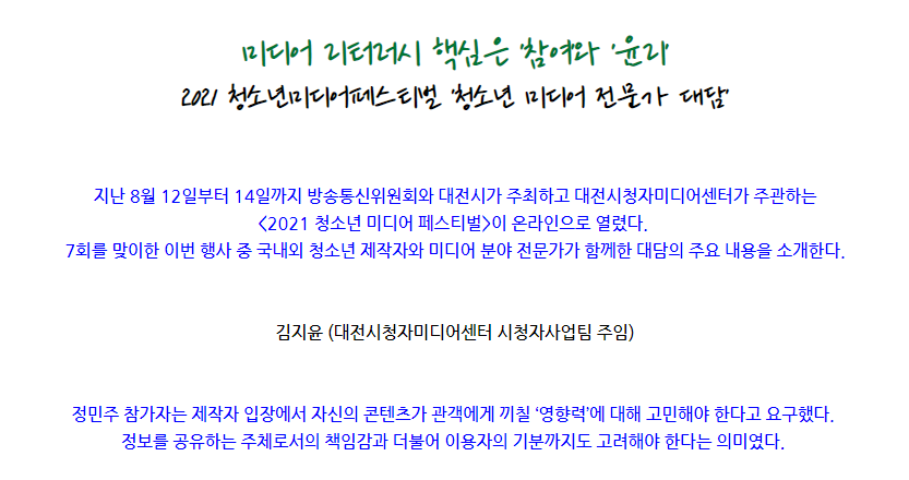 이번 대담은 국내외 청소년의 목소리로 미디어 리터러시의 의미를 재정의하고 미디어교육의 새로운 패러다임을 제시했다는 점에서 큰 의미가 있다. 특히 정민주 제작자의 경험 사례는 미디어교육 기관으로서 대전시청자미디어센터의 역할을 재고하게 만든다. 학교 안팎에서 다양한 교육과 제작 지원 사례를 쌓고, 제작과 참여 역량뿐만 아니라 기존 산업 질서 속에서 제작자로서의 윤리 의식을 길러주는 것이 중요하다. 왕도는 없을 것이다. 지금보다 더 부단히 청소년을 만나고 담론의 주체로 불러와야 한다.