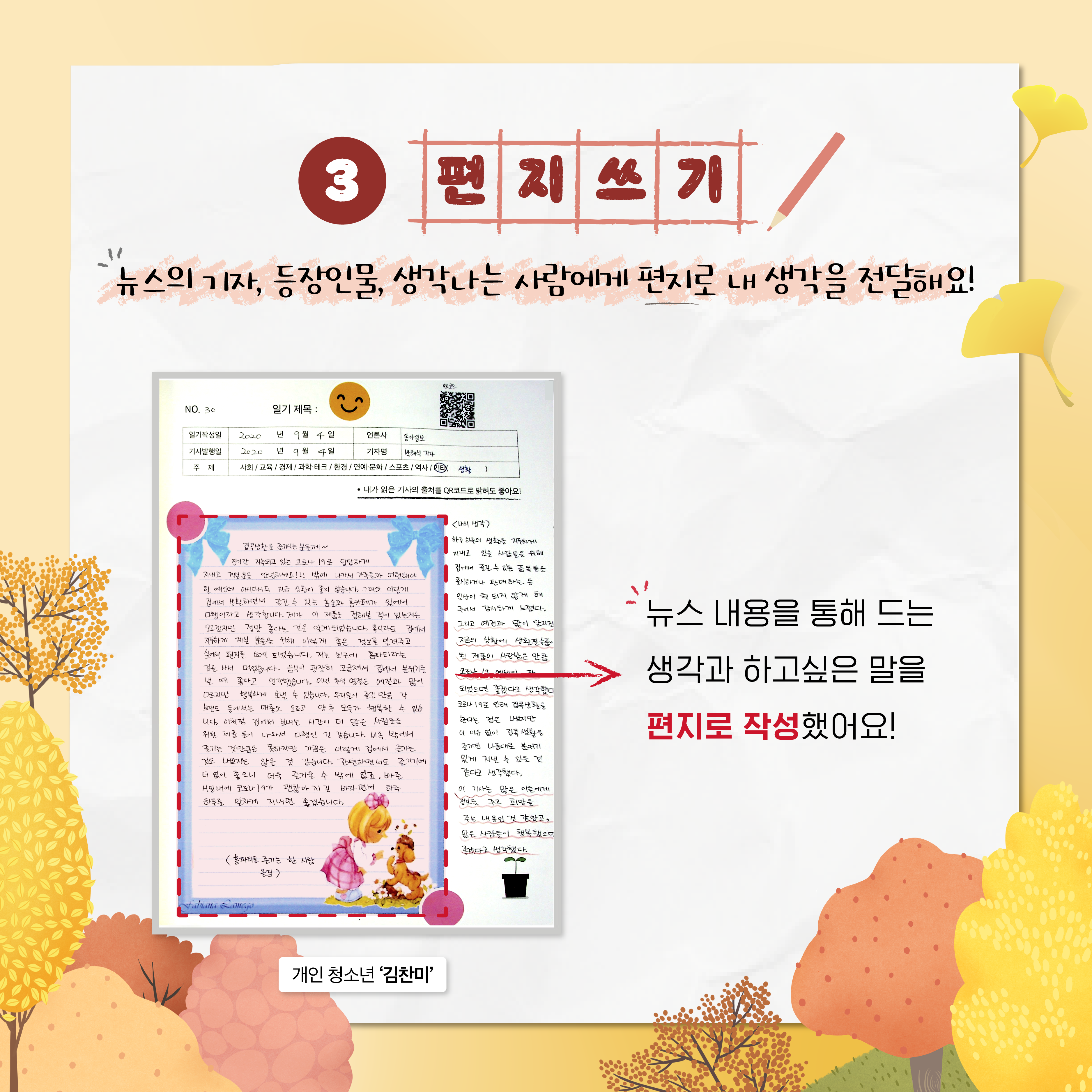 편지의 수신자는 뉴스의 기자, 등장인물, 혹은 이 기사를 보고 떠오르는 사람,