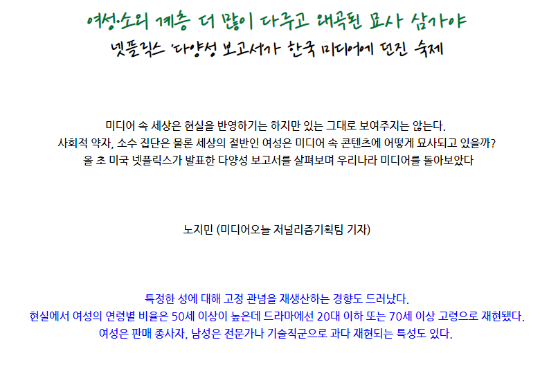 그러나 한국의 대중 미디어 플랫폼에서 전격적 변화를 찾기는 어렵다. ‘왓챠’, ‘퍼플레이’와 같이 성평등·다양성에 특화된 OTT들이 이와 관련한 큐레이션을 선보이는 정도다. 최근 일부 드라마에서 여성 중심 서사를 펼치거나 고정 관념에서 벗어난 성소수자 재현이 이뤄지고 있으나 대형 플랫폼 차원의 자발적인 평가나 정책으로 이어지진 않고 있다.