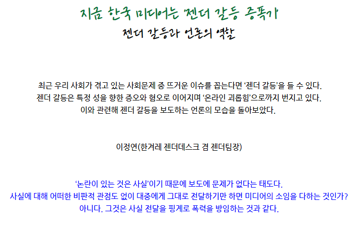 기자·언론이라면 기본적으로 지켜야 하는 방침, 「언론윤리강령」의 내용이다. ‘차이와 불화를 침소봉대해 갈등을 극대화하는 보도 태도를 지양한다’는 대목이 특히 뼈아프다. 지금 한국 언론은 거의 모든 분야에서 갈등을 극대화한 보도 행태를 보이고 있다. 무엇보다 젠더 이슈는 언론이 갈등을 조장하고 있다고 봐도 무리가 없는 수준이다. 오늘날 미디어는 젠더 갈등의 ‘증폭기’ 역할을 하고 있다.