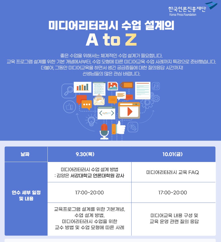 그래서 미디어 리터러시에 대해 열심히 공부해야겠다는 결심을 하고 난 뒤, 한국언론진흥재단에서 기획하는 미디어 리터러시에 관한 연수는 거의 빠짐없이 눈에 불을 켜고 연수 신청을 하고 열심히 배웠습니다. 물론 배운 내용을 실제 수업으로 구현해보면서 계속해서 피드백을 받고 더 나은 수업을 만들어갈 수 있다면 더 좋았겠지만 ‘먼저 나의 수업 밑거름을 만들자!’ 라는 생각으로 열심히 연수를 찾아 듣게 되었습니다. 그러다 보니 ‘미디어리터러시 수업 설계의 A to Z’라는 연수를 만나게 되었습니다. 본 연수는 좋은 수업을 위해서는 체계적인 수업 설계가 필요하듯이 교육 프로그램 설계를 위한 기본 개념에서부터, 수업 모형에 따른 미디어교육 수업 사례까지 배울 수 있다는 아주 솔깃한 내용이었습니다.
