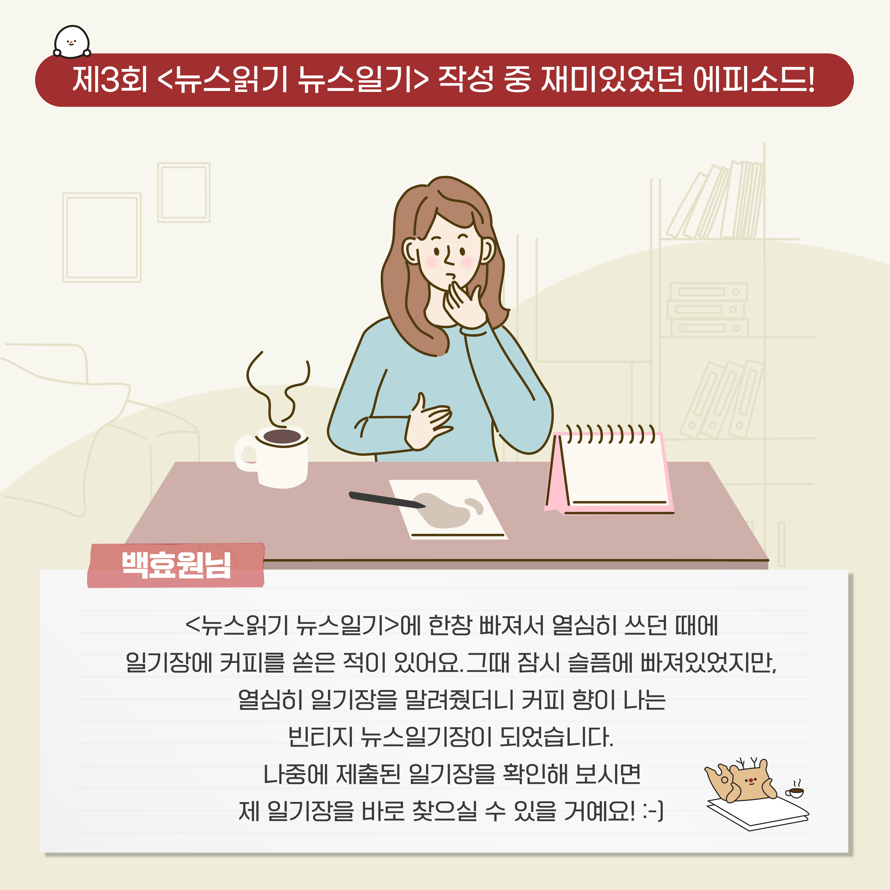 백효원님께서는 뉴스일기에 커피를 쏟으신 적이 있대요.