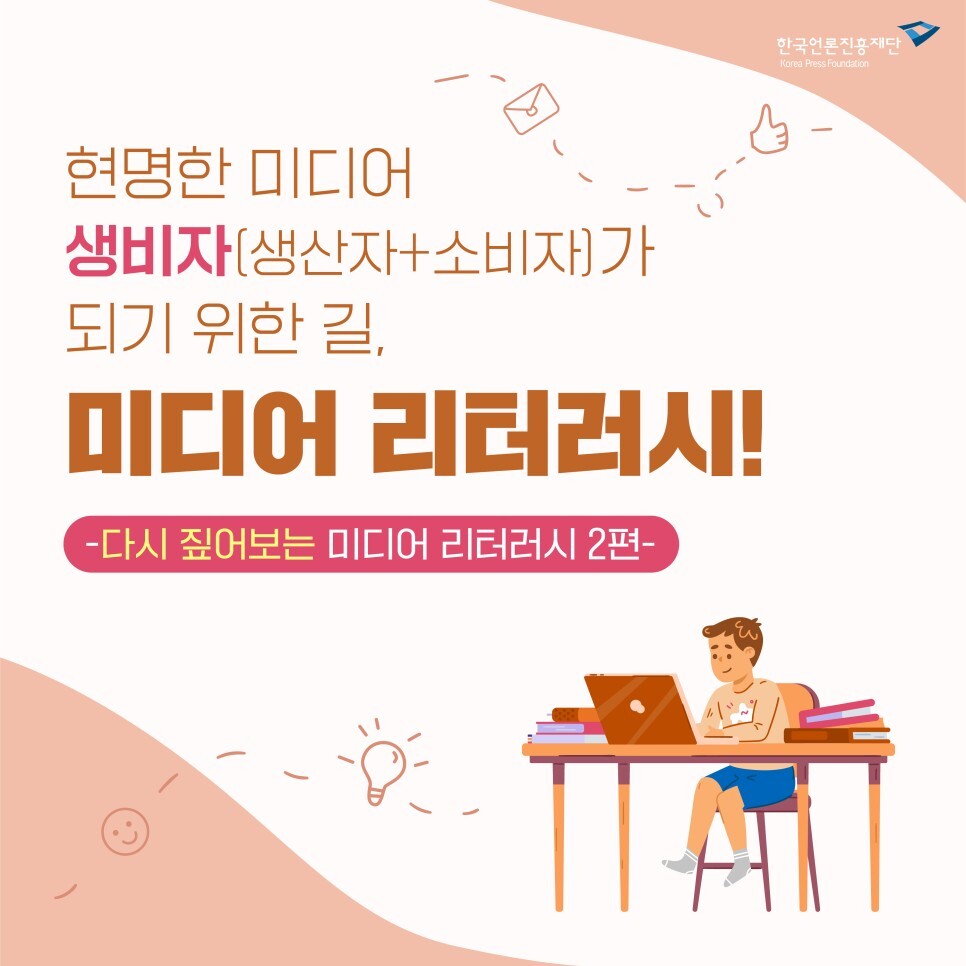안녕하세요, 한국언론진흥재단입니다. 이제는 많은 분들께서 미디어 리터러시에 대하여 이제는 잘! 알고 계시지요? 올바른 미디어 사용을 위해 미디어 리터러시에 대하여 다시 한번 점검해 보