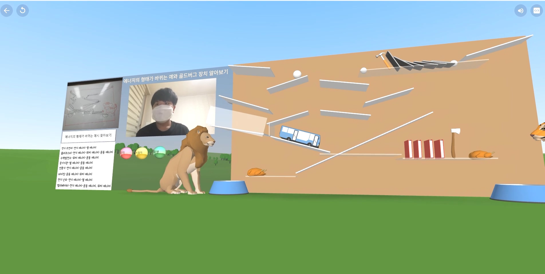 6학년 2학기 5단원 ‘에너지와 생활’에서는 에너지의 형태가 전환되는 과정을 다룬다. 이를 코스페이시스(CoSpaces)1)라는 가상(증강)현실 기반의 메타버스 플랫폼을 활용해 수업을 진행했다. 코스페이시스는 물리 엔진을 적용하여 3D 모델로 가상현실을 구현할 수 있는 플랫폼이다. 따라서 특정한 물리적 현상을 시뮬레이션하기 유리한데, 이를 통해 학생들이 팀을 나누어 직접 골드버그 게임 장치를 개발해 보았다. 골드버그 장치란 쉽게 예를 들자면 높은 위치에 있던 구슬이 아래로 떨어지면서 굴러와 도미노에 충격을 주어 넘어트리고, 넘어진 도미노가 또 다음 구조물에 영향을 주고, 이러한 과정이 계속 반복되면서 보는 이로 하여금 과학적 상상력과 흥미를 느끼게 하는 장치이다. 가상의 공간 속에서 학생들이 협업하여 3D 개체를 이용해 골드버그 장치를 만들고 시뮬레이션 해보는 과정을 통해 자연스럽게 에너지가 보존되며, 형태가 전환되는 과정을 느낄 수 있도록 했다.