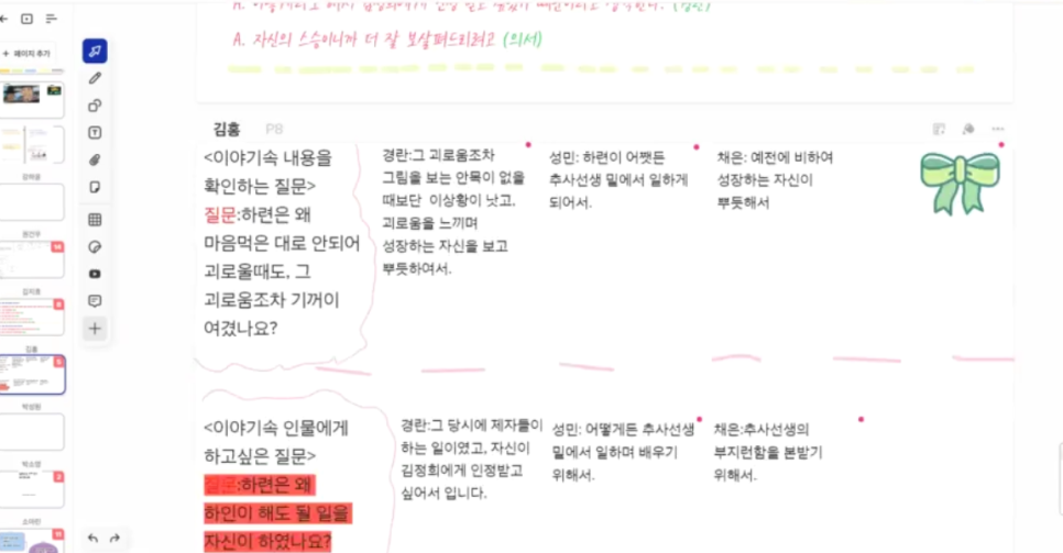 이 단원에서 학생들은 먼저 교과서 제시 작품인 ‘구멍 난 벼루’의 내용을 파악하고 인물이 추구하는 삶을 파악했다. 미리 만들어 놓은 ‘구멍 난 벼루 메타버스 공간 및 인물 캐릭터’와 상호작용하고, 간단한 술래잡기 게임을 하면서 잡힌 술래가 가상인물의 역할을 맡아 서로가 질문을 만들어 주고받는 활동도 함께 이루어졌다. 활동 후에는 실시간 비대면 캔버스 협업 툴인 알로(ALLO https://allo.io)를 활용해 학습 내용을 정리하면서 서로 생각을 나누었다.