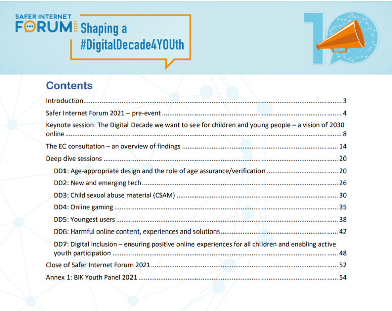 이러한 흐름에 이어 2021년 10월에는 유럽집행위원회 주도로 ‘더 안전한 인터넷 포럼 2021(Safer Internet Forum 2021, 이하 SIF 2021)’이라는 행사가 5일~7일, 3일에 걸쳐 개최됐다. 유럽집행위원회는 아동과 청소년에게 적합한 ‘디지털 10년’ 추진 방안을 모색하기 위해 SIF 2021을 기획했다. 이번 포럼 진행은 유럽의 교육부 산하 비영리 조직인 유럽학교네트워크(European Schoolnet)가 맡았다. 이러한 움직임은 유럽 사회가 더 나은 디지털 10년을 위한 청사진의 주체로 아동과 청소년을 상정하고 있다는 점을 보여준다.