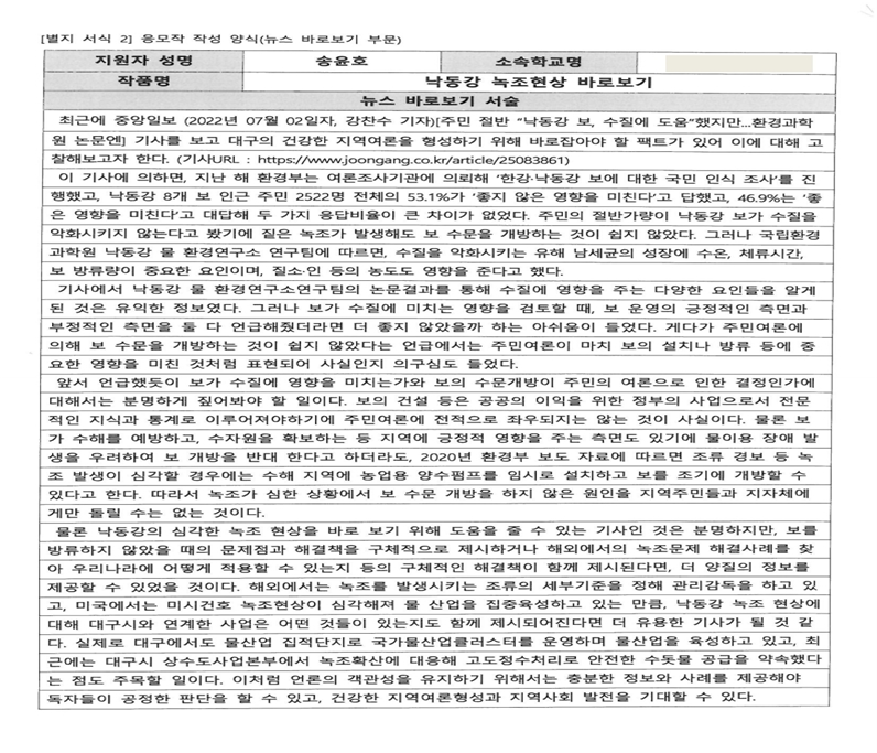 이번 공모전을 통해 뉴스 기사를 비판적으로 보고, 기사의 잘못된 부분과 부족한 부분을 찾아 지적할 수 있는 사고 능력을 기를 수 있었습니다. 더불어 뉴스를 볼 때 사실과 의견을 구분하며 읽는 것이 중요함을 배울 수 있었습니다. 이번 공모전을 준비하며 많은 것을 배울 수 있었고 값진 결과도 얻을 수 있었기에 저에게 큰 의미가 있다고 생각합니다. 앞으로도 사회 이슈에 관심을 가지고 비판적 사고 능력과 정보 분별력을 바탕으로 책임감을 가지고 정보를 습득, 활용하는 민주 시민으로서의 역량을 기를 것입니다.