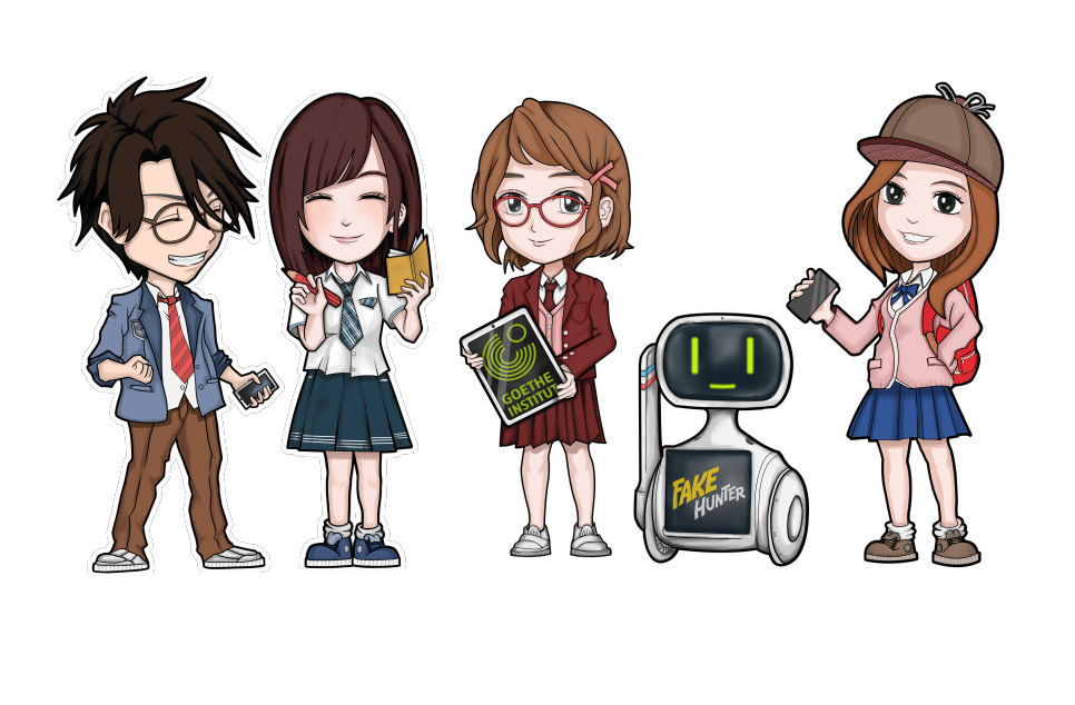 주한독일문화원은 한국 청소년에게 페이크헌터 프로그램을 더욱 친근하게 소개하기 위해 ‘가짜뉴스 판별 도구’ 개수에 맞춰 총 5명의 캐릭터를 특별 제작했다. 각 캐릭터는 캐릭터별 특징에 걸맞은 ‘가짜뉴스 판별 도구’를 각각 하나씩 맡고 있고, 이들은 작명 공모전 ‘내 이름을 찾아줘’를 통해 이름이 붙여졌다.