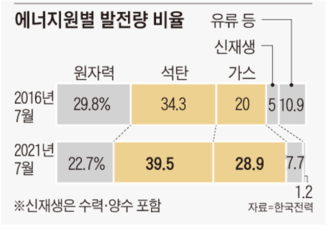 [그림1] 2016년 7월과 2021년 7월의 에너지원별 발전량 비율 비교