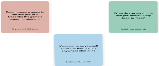 Right now we are launching our new card box called «Talk!». Research shows that parents and adults focus on time spent online over the content young people meet online. Parents tend to focus on how long time their kids could be on their phone. Unfortunately parents don’t have a clue of what’s going on online. We need to help parents to establish a conversation about how the youth experience their life online so youth know that they could talk to their parents if they experience something bad online. These cards provide conversation starters about questions and quotes that both youth and parents could talk about without arguing or angry voices. The cards are connected to three different groups: Gaming(red), Social Media (blue)and Digital everyday life (green). All together we have around 70 different cards. Here are some examples: