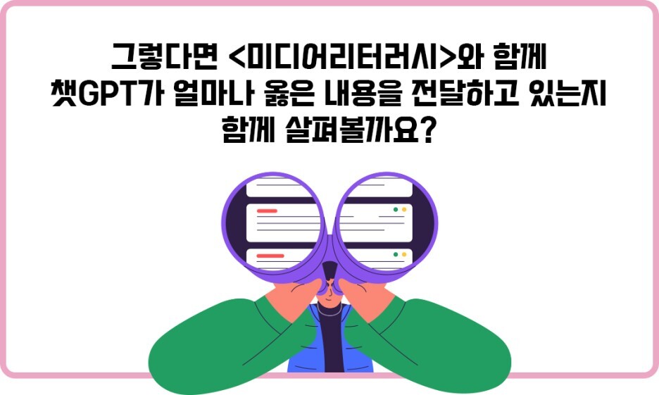 그렇다면 <미디어리터러시>와 함께 챗GPT가 얼마나 옳은 내용을 전달하고 있는지 함께 살펴볼까요?