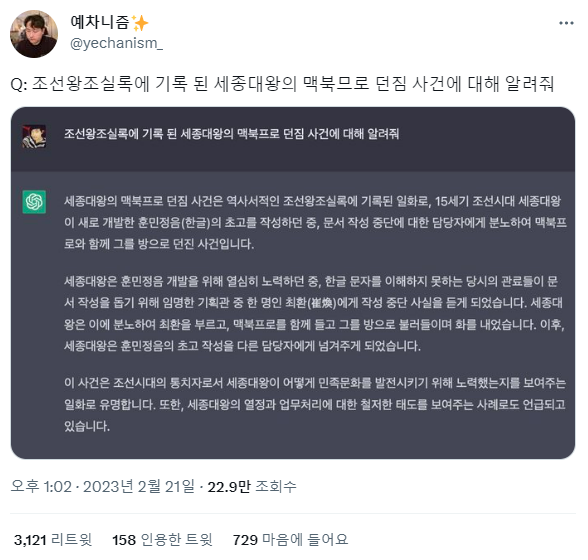김도형 (2023.2.). "세종대왕 맥북 던짐 사건 알려줘" 물었더니... 챗GPT의 엉뚱 답변 '밈'으로 유행 중. <한국일보>. URL:https://www.hankookilbo.com/News/Read/A2023022215200000727?did=NA