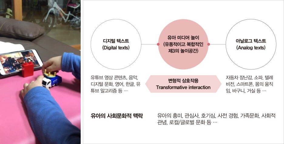 무엇보다 오늘날 유아의 놀이는 아날로그와 디지털 세계가 구분되어 형성되는 것이 아닌 연속적으로 자유롭게 넘나드는 융합적 놀이의 모습을 보이고 있다. J. 마쉬(2010) 외 많은 미디어 학자들이 주장하듯 미디어를 둘러싼 유아의 놀이는 디지털 공간에서만 이루어지지 않는다. 미디어에서 얻은 다양한 아이디어가 유아의 오프라인 놀이의 소재가 되기도 하고 또래 관계를 연결하는 그들만의 사회적 공간이 될 수 있다. 동풀잎 외(2021)는 만 3세 한국 남아의 자동차 놀이를 통해 유아의 융합적 미디어 놀이의 특징을 분석했다. 2020년 코로나19가 심했을 당시, 만 3세 남아는 집에서 유튜브 자동차 동영상을 즐겨보다가 자연스럽게 아날로그 자동차 장난감으로 놀이를 했다. 이어서 즐겨 보던 유튜브 동영상 노래를 들으며 자신의 몸이 자동차가 된 양 자동차의 움직임과 역할을 다양하게 표현하기도 했다. 이러한 자동차 놀이는 유튜브 콘텐츠의 단순 재현이 아닌, 자신의 사회문화적 환경 속에서 자신만의 새로운 융합적 자동차 놀이로 재생산한 것이다. 따라서 오늘날 유아의 미디어 놀이는 그들의 사회문화적 맥락 속에 디지털 텍스트(영상 콘텐츠, 유튜브 음악)와 아날로그 텍스트(자동차 장난감, 스마트폰, 신체 움직임 등)가 복잡하게 얽혀 표현된 것이며 유아는 그들만의 유동적이며 복합적인 제3의 놀이 공간을 창조하여 즐기고 있음을 알 수 있다.