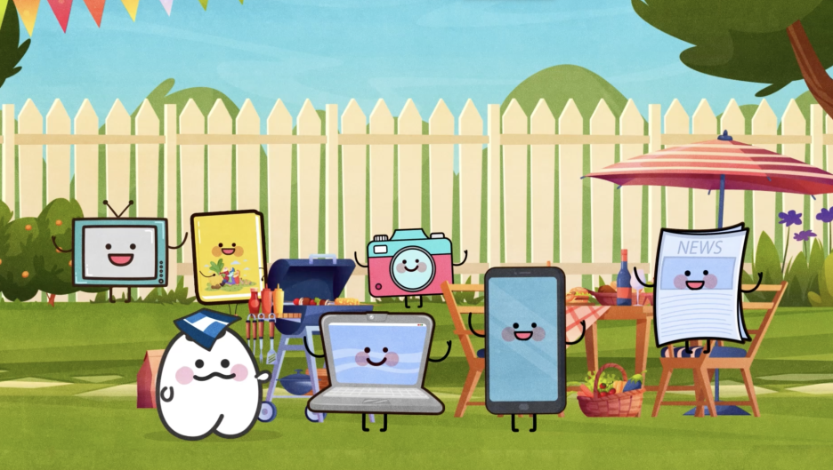 유아가 미디어의 개념을 이해하고 있는지 알아보고 미디어 수수께끼를 통해 우리 주변의 다양한 미디어 종류와 특징에 관심을 가질 수 있도록 수업을 구성했다. 먼저 유아에게 ‘미디어란 무엇일까?’라고 질문했을 때 대부분의 유아는 ‘미디어’라는 단어를 알지 못했다. 이때 ‘미디어 파티에 갈 친구는 누구?’라는 영상을 먼저 보여주었다. 영상에서 주인공 ‘로니’가 미디어 파티에 갈 미디어 친구들을 찾는 과정이 나오는데, 영상을 본 유아들은 미디어란 ‘정보나 하고 싶은 이야기를 전달해 주는 것’임을 이해하고 영상에서 나오는 미디어의 종류를 통해 미디어에는 컴퓨터, 스마트폰, 텔레비전 같은 기기뿐만 아니라 책, 카메라도 포함됨을 알 수 있었다.