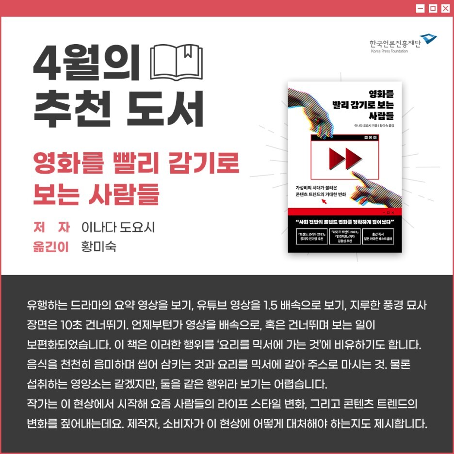 유행을 따라가려면 봐야 할 작품도, 주기적으로 확인해야 할 SNS도 넘쳐나는데 시간이 부족하니 빨리 감기라는 기능이 인기를 끈다는 것입니다.