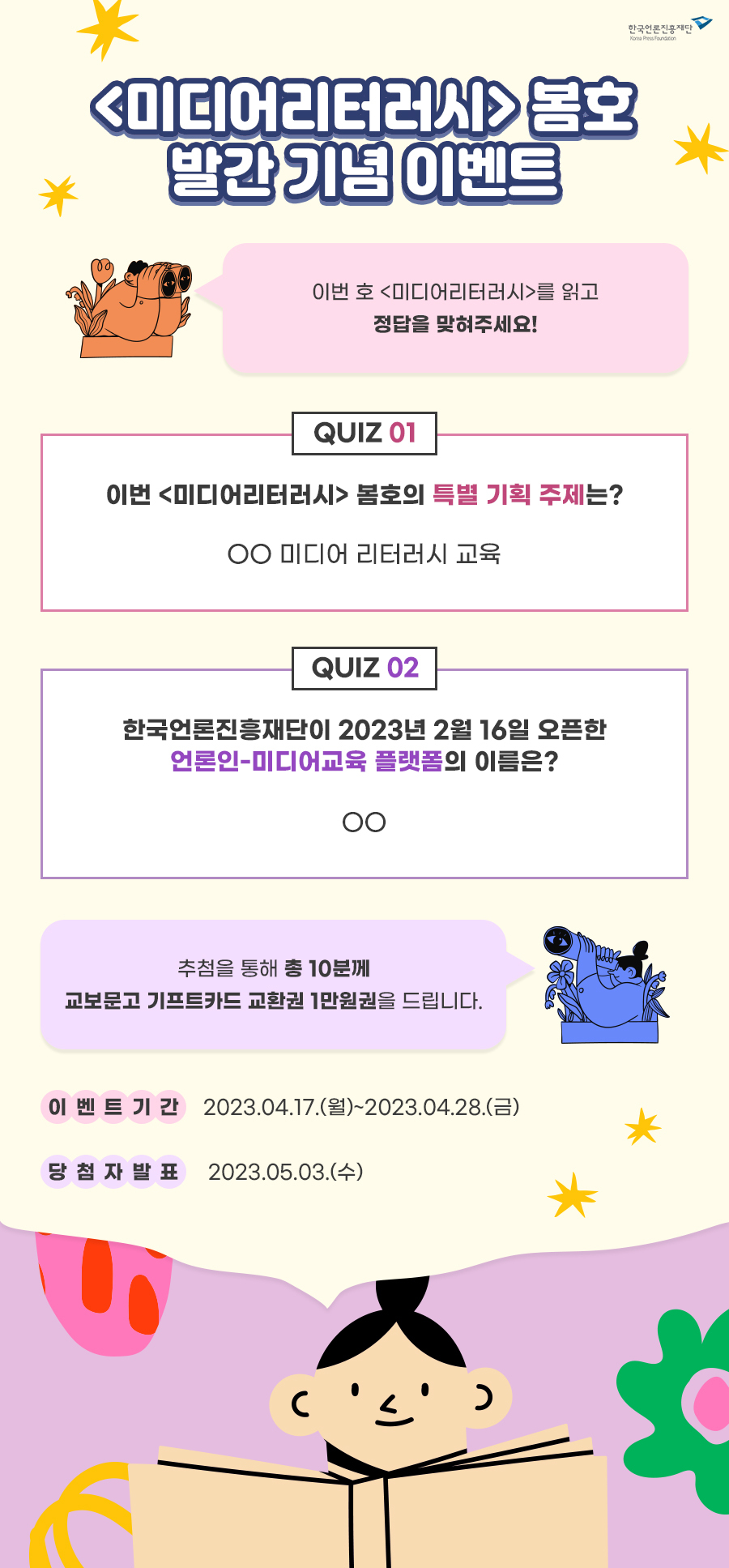 이번 호 <미디어리터러시>를 읽고 정답을 맞혀주세요! 추첨을 통해 총 10분께 교보문고 기프트카드 교환권 1만원권을 드립니다 이벤트 기간 : 2023.04.14.(금)~2023.04.28.(금) 당첨자 발표 : 2023.05.03.(수)