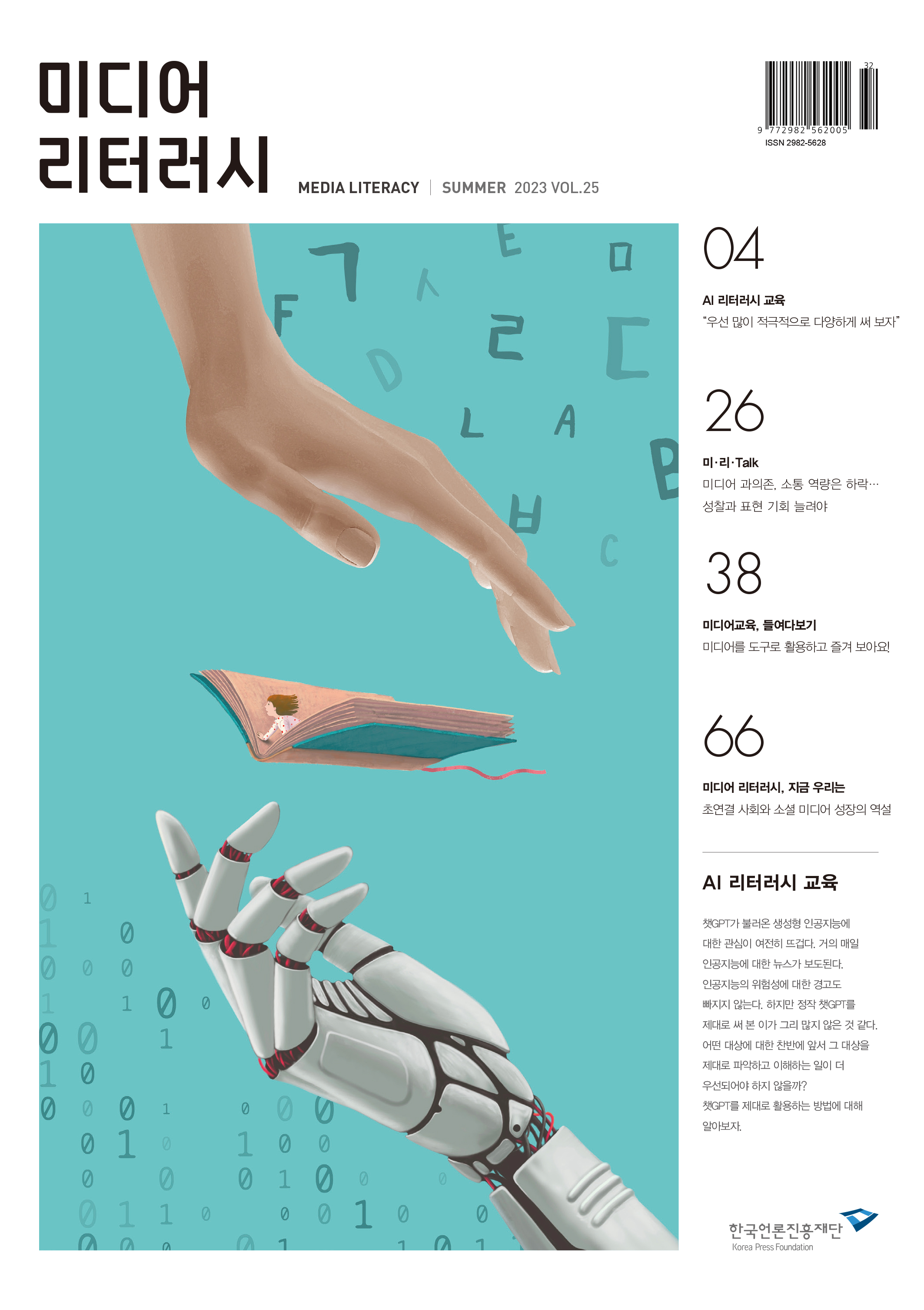 한국언론진흥재단은 2023년 8월 미디어리터러시 여름호(통권 25호)를 발행하였다. 미디어리터러시 여름호에서는 <특집: AI 리터러시 교육>을 주제로 챗GPT를 비롯한 생성형 인공지능 서비스를 미디어교육에 활용하는 방법에 대해 살펴보았다.