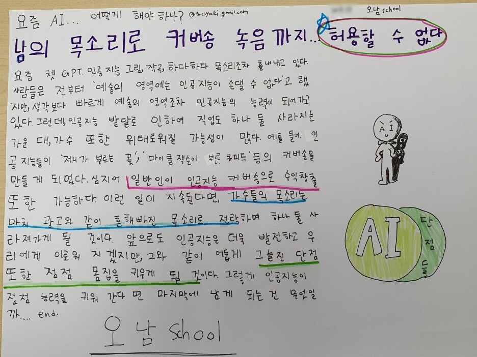‘최애 아티스트의 목소리로 모든 노래를?’을 주제로 진행한 오남중 1학년 학생의 수업 결과물. <사진: 필자 제공>