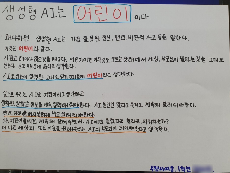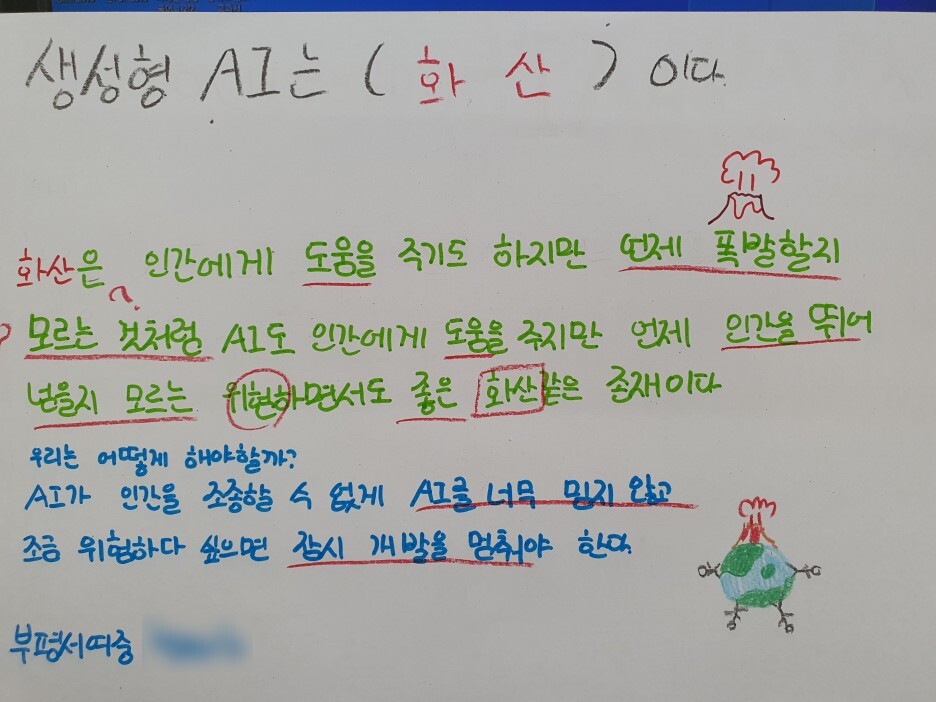 과연 학생들은 AI에게 어떤 별명을 붙였을까요? 지나는 ‘화산’이란 별명을 붙여 주며, “언제 폭발할지 모르는 화산처럼 언제 인간을 뛰어넘을지 모르기 때문에 조금 위험하다 싶으면 잠시 개발을 멈춰야 한다”고 제안했죠. 유진이는 거짓말을 지어내는 ‘구라쟁이’이므로 “AI가 무조건 옳다고 믿어서는 안 된다”며 비판적 사고를 강조했습니다. 태연이는 ‘어린이’란 별명을 붙였습니다. 어린이가 부모님이 알려주는 내용을 그대로 믿듯이 AI 역시 사람이 입력하는 것을 그대로 믿기 때문이라나요? 그리곤 “AI가 틀렸다(잘못했다)며 미워하지 말고, 더 나은 세상을 위해 편견과 거짓말을 하지 못하도록 막는 부모 역할을 해야 한다”는 의젓한 제안을 했습니다.