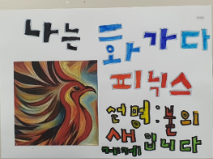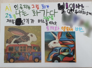 A가 기차를 그리며 설명했습니다. “어렸을 때 기차가 나오는 애니메이션을 보고 기차가 좋아졌어요.” “기차를 바라보는 소도 그리고 싶어요.” “전 고갱 그림이 좋아요.” 예시로 제시한 화가 이름 중에 고갱의 이름이 없었지만, 클래식 음악을 좋아하는 A는 화가 고갱에 대해 알고 있었던 것이죠. A는 처음엔 고흐 스타일로, 뒤이어 고갱 스타일로 그림을 표현했습니다. 고양이를 키우고 싶었던 B는 귀여운 고양이를 그렸습니다. 고양이 그림을 현관문에 붙여 놓겠다며 그림 제목을 예쁘게 쓰고 활동지를 소중하게 껴안았습니다. 평소 지하철과 버스 등의 교통수단에 관심이 많던 C는 버스에 탄 토끼와 앵무새를 그렸습니다. 늘 차분하고 진지하게 수업에 임하는 D는 500년마다 한 번씩 불에 타 죽고 부활한다는 이집트 신화 속의 불새 피닉스를 에너지 넘치게 표현했죠.