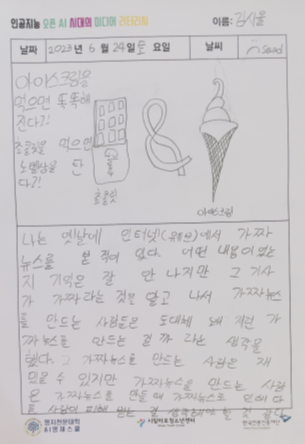 5회차에는 생성형 인공지능을 활용하여 뉴스 기사를 작성해 보고, 방송 리포트 프로세스에 대해 알아보았다. 뉴스 기사를 작성하기 위한 구체적인 방법론과 뉴스 기사 작성에 어떻게 생성형 인공지능을 활용할지에 대해 구체적으로 살펴보았다. 더불어 자신이 작성한 뉴스 기사를 직접 보도하기 위해 아나운서 발성 연습을 진행하여 보다 생생한 미디어 리터러시 경험을 제공했다.