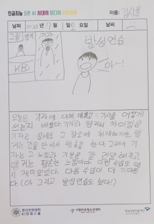 5회차에는 생성형 인공지능을 활용하여 뉴스 기사를 작성해 보고, 방송 리포트 프로세스에 대해 알아보았다. 뉴스 기사를 작성하기 위한 구체적인 방법론과 뉴스 기사 작성에 어떻게 생성형 인공지능을 활용할지에 대해 구체적으로 살펴보았다. 더불어 자신이 작성한 뉴스 기사를 직접 보도하기 위해 아나운서 발성 연습을 진행하여 보다 생생한 미디어 리터러시 경험을 제공했다.