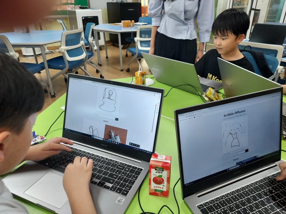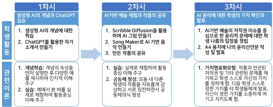 1차시에는 강사가 생성형 AI의 개념과 속성을 소개한 후 사례를 제시하며, AI가 할 수 있는 활동이 무엇인지 알아보면서 AI 개념에 대해 인지적으로 이해하는 시간을 가졌다. 이때 학생들은 챗GPT를 활용해 간단한 자기소개서를 만들었다. 이 과정에서 자신의 모든 정보를 AI에게 투입할 경우 정보가 노출될 수 있다는 점도 함께 학습하여, 보안에 대한 윤리적 쟁점에 대해서도 성찰할 수 있는 기회를 가졌다. 2차는 스크리블 디퓨전(Scribble Diffusion)과 송 메이커(Song Maker)라는 AI 기반 작품 창작 도구를 활용하여 노래와 그림을 만들었다. 7월 첫 수업 시에는 노래와 그림 만들기를 모두 진행했으나, 두 가지 활동을 모두 했을 때 학생들의 집중력이 흩어지는 점을 감안해, 9월 수업에서는 그림 그리기만 진행했다. 3차 수업에서는 그림의 저작권이 누구에게 있는가를 중심으로 모둠별 토론을 진행했다. 학생들은 토론을 하며 자신의 입장을 정리하고, 이를 A4 용지에 선언문으로 작성하여 타인과 공유하면서 AI 윤리에 대한 자신의 가치를 명료화했다. 차시별 수업이 끝난 후 쉬는 시간이 주어졌지만 학생들은 쉬는 시간에도 활동에 몰입할 정도로 열심이었다.