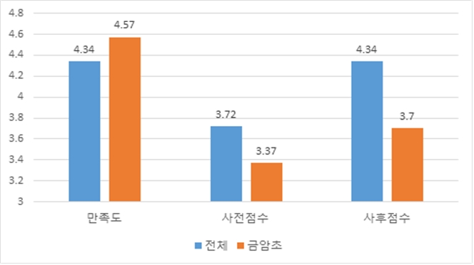 AI 리터러시와 윤리에 관한 사전 사후 설문에서 금암초 학생들은 사전 설문에 3.37점, 사후 설문에 3.70점을 기록, 0.33점이 높아졌다. 특히 윤리에 관한 사전 설문에 3.29점을 기록했던 학생들은 사후 설문에 3.75점을 기록하여 ‘홈 포 유스’ 프로그램의 교육 효과를 보여주었다.