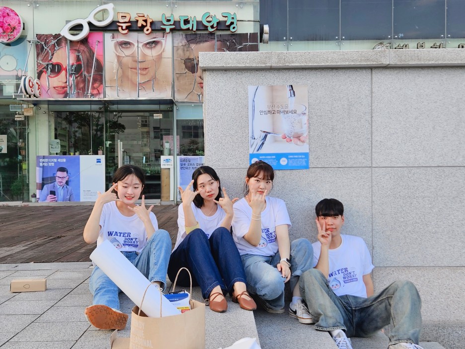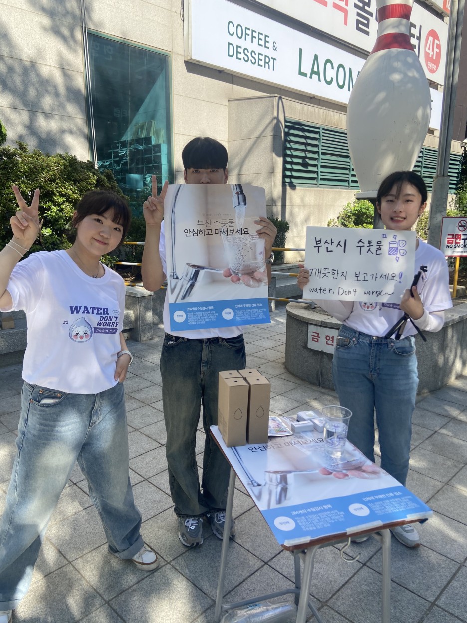 부산시 수돗물에 대한 인식 개선이 급선무임을 느꼈던 우리는 전 연령층과 직접적으로 소통할 수 있는 오프라인 홍보를 위주로 진행했다. 그래서 수돗물의 안전성을 실험해볼 수 있는 키트를 들고 대학가로 나가 직접 시민들 앞에서 실험을 했다. 키트 결과를 눈으로 바로 확인할 수 있었기 때문에 흥미를 유발하기 쉬우면서도 객관성을 유지할 수 있어 여러 시민의 참여를 이끌어낼 수 있었다. 이 과정에서 미리 제작한 자체 캐릭터와 포스터를 활용하여 시민의 이해를 도왔다. 다양한 온·오프라인 홍보를 위해 현수막 제작, 홍보 포스터 제작, 자체 캐릭터 로고가 새겨진 물병과 스티커 등의 굿즈를 직접 제작했다. 또한 서울시에서 진행한 학생 대상 아리수 홍보 활동에 착안하여 부산시 고등학생을 대상으로 간단한 교육을 하기도 했다. 학생들 사이에 만연한 부산시 수돗물에 대한 편견을 바로잡아주고 팩트체크 과정에서 발견한 통계를 바탕으로 안전성에 대한 신뢰를 보여주었다.
