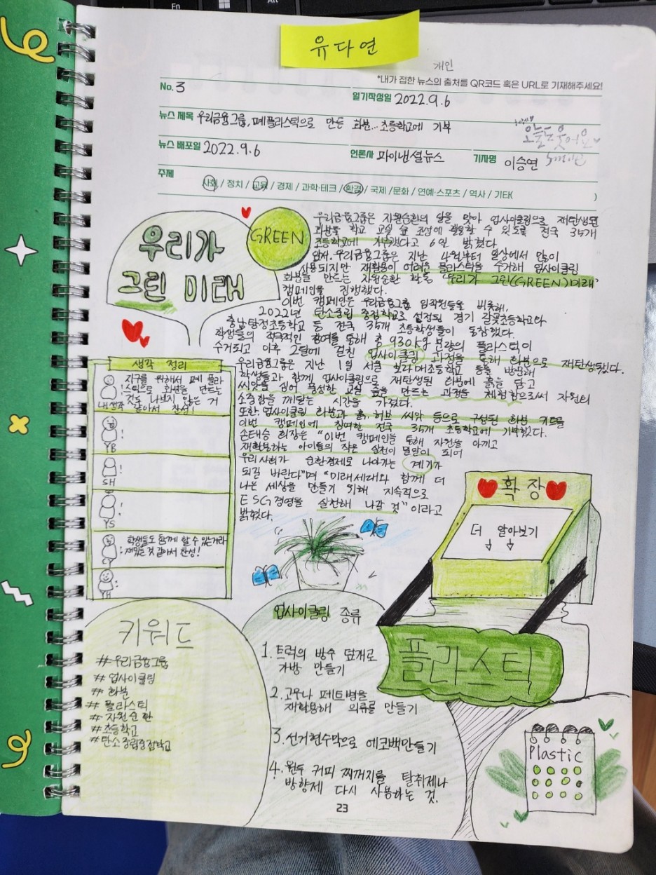 국어와 한문으로 기초를 다진 이후의 일기 작성은 훨씬 수월해졌다. 뉴스는 자신의 흥미와 진로를 고려해 선정하고, 뉴스일기는 일주일에 한 편씩 꾸준히 작성해 검사받도록 정했다. 학생들이 일기를 써오면 피드백을 해주었다. 우리 학교 1학년 학생은 180여명인데, 나는 모두에게 1인 1뉴스일기를 신청했고, 각자 30회의 일기를 작성하도록 했다. 모두 성실하게 잘 따라와 주었다. 일기장에 깨알같이 적어준 나의 코멘트에 학생들은 작은 응답을 하듯이 나날이 자신의 생각을 한 줄씩 덧붙이기 시작했다. 그리고 한 명, 두 명, 30편의 일기를 완성해냈다.
