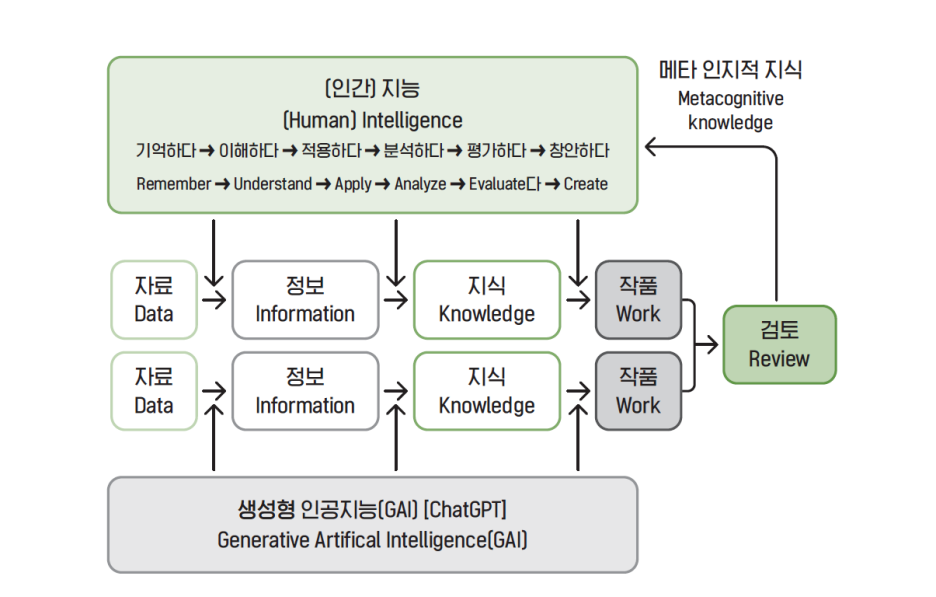 생성형 인공지능 시대에는 지식을 생성하는 주체를 인간과 인공지능으로 구분해야 한다. 인간은 자료를 찾고, 구조화해 정보를 만들고, 정보를 누적하여 지식을 구성하는 과정에서 인지 능력과 문제 해결 능력이 발달한다. DIKW(Data,Information, Knowledge and Work) 계층구조는 생성형 인공지능이 지식을 생성하는 과정을 인간의 지능과 비교할 수 있는 유용한 프레임워크다.