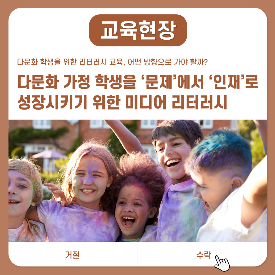 그리고 앞서 언급한 우리 사회의 다문화 수용성 및 정서 등을 고려하였을 때, 다문화 학생이 상황을 합리적이고 주체적으로 판단하도록 하기 위해서는 리터러시(literacy)가 반드시 뒷받침되어야 한다. 메시지의 발신자가 의도하는 대로 수동적으로 메시지를 받아들이는 것이 아니라, 그 이면에 불투명하게 감추어진 상황들을 파악하고 올바로 이해할 수 있는 능력을 갖추어야 올바른 협상이 되고 건전한 이중정체성이 형성될 수 있기 때문이다.