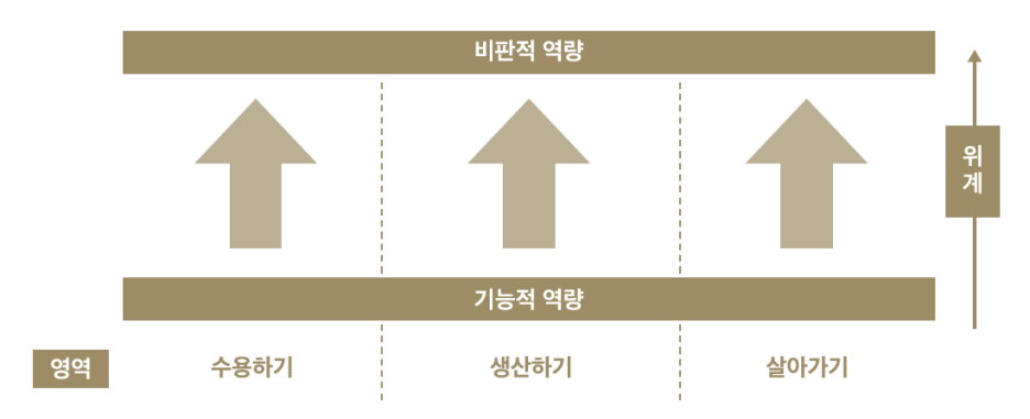 다음으로 선행 논의들이 주로 학습자의 리터러시를 기능적 리터러시에서 비판적 리터러시로 발달해 간다고 논의하고 있으므로, 이에 따라 유능하고 건강하게 살아가는 수준을 기능적 리터러시로, 비판적 시민으로 살아가는 데 필요한 능력을 비판적 리터러시로 위계화했다. 예를 들어 미디어 콘텐츠를 기능적으로 접하고 소비하는 ‘(기능적) 소비’, 미디어를 활용하여 자신의 메시지를 표현할 수 있는 ‘(기능적) 표현’, 디지털 공간에서 안전하게 살아가기 위해 자기를 조절하고 위험성을 인식하여 대처할 수 있는 ‘자기조절 및 안전’ 등은 기능적 역량에 해당한다. 비판적 리터러시로는 수용 활동에서 미디어 콘텐츠와 환경 및 공유의 맥락을 종합하여 비판적으로 분석하고 평가하는 ‘평가’, 생산 활동에서 다른 사람과 교류하는 과정을 통해 사회에 참여하는 ‘참여적 창작’, 살아가기 영역의 활동에서는 여러 공동체의 구성원과 협력하여 문제를 해결해 나가는 변혁적 역량으로서의 ‘협력적 문제해결’ 등이 중요한 교육 요소이다. 각 요소를 제시하면 다음과 같다.