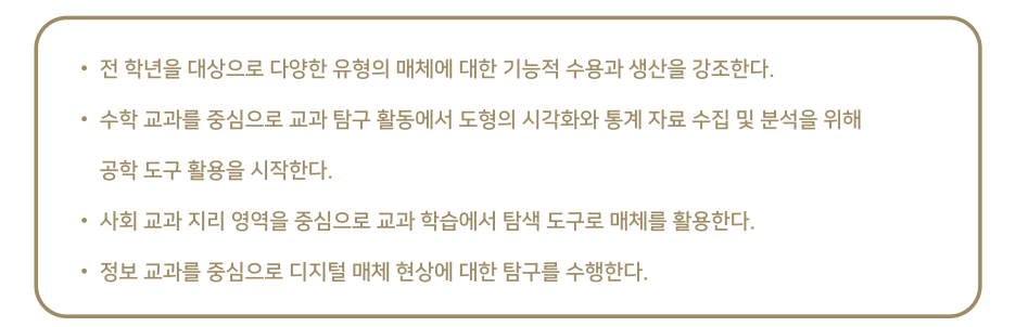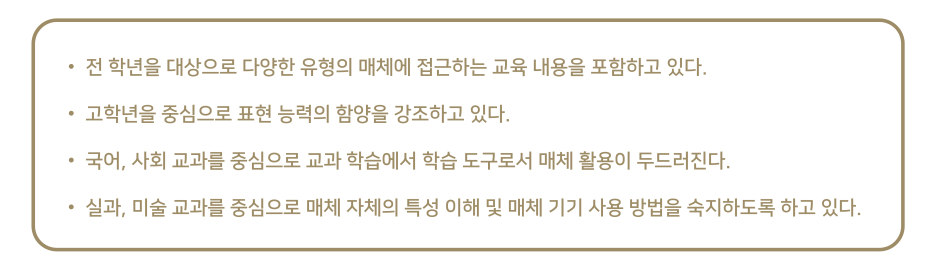크게 보았을 때 교급별 매체 교육 내용은 초등 단계에서 매체 접근, 기초 표현 능력 → 중학 단계에서 매체의 기능적 수용·생산 → 고등 단계에서 매체의 비판적 수용·생산과 같이 교급 간 계열성을 갖추고, 교급 단계에 따라 점차 심화되는 양상으로 제시되는 한편, 모든 교급에서 교과 학습의 도구로 매체 활용을 강조하여 미디어를 활용한 교육이 중요하게 나타나고 있었다.