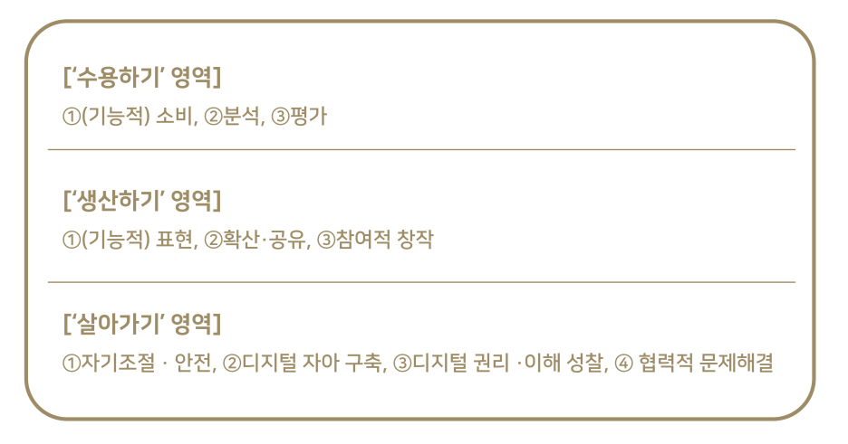 우리는 직관적으로 이해하기 쉬운 프레임워크를 제안하는 데 초점을 두기 위해, 인간이 온라인에서 하는 활동을 중심으로 교육 영역을 구분했다. 미디어 환경에서 우리의 활동은 크게 이해하고 표현하는 활동으로 구성된다. 이를테면 미디어에 대해 이해하고, 미디어를 통해 무엇인가를 이해하고, 미디어를 활용해 표현하고, 이해와 표현을 동시에 수행하는 소통 활동을 하는 것이다. 그러면서 자신의 감정과 의견을 구성하고, 삶을 구성해 나가며, 문화와 사회를 변화시킨다. 교육과정에서는 이해 활동을 ‘수용’이라는 용어로, 표현 활동을 ‘생산’이라는 용어로 나타내고 있으므로, ‘수용하기’와 ‘생산하기’ 영역을 구성했다.
